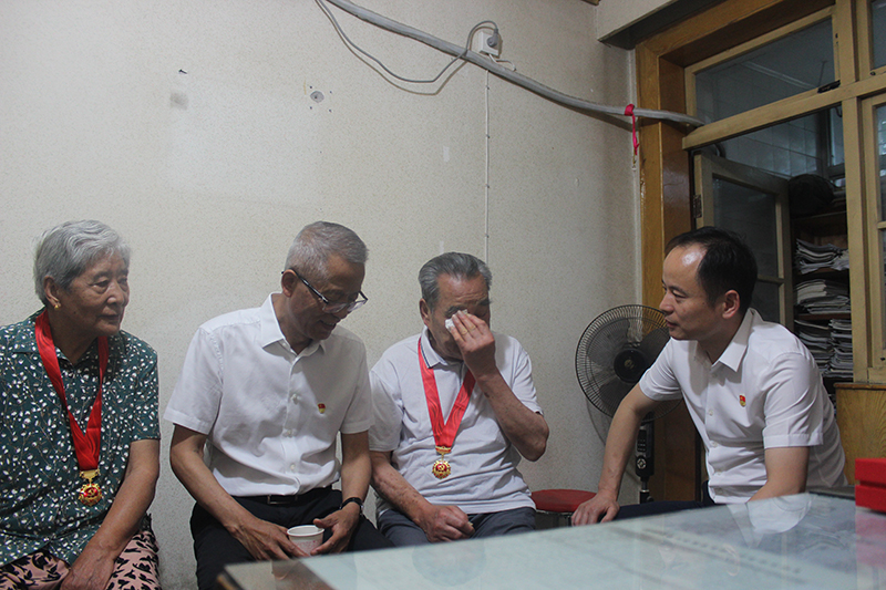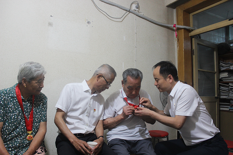 在小區(qū)離退辦,王建國詳細詢問了老人們的身體狀況、生活情況,囑咐老人要注意保重身體,并叮囑隨行人員一定要結合黨史學習教育,帶著感情、帶著責任幫助他們解決實際困難,落實好各項政策,照顧好日常生活,讓他們切實感受到組織的溫暖、幸福愉快地安享晚年。他為在黨50年的老黨員們親手佩戴了黨中央頒發(fā)的“光榮在黨50年”紀念章,并與部分老黨員進行了座談。佩戴上黨章的老黨員們熱淚盈眶,激動地唱起《沒有共產(chǎn)黨就沒有新中國》等革命歌曲,慷慨激昂的旋律,高亢熱情的聲音,彰顯了老一輩共產(chǎn)黨員初心不改的熱忱。大家紛紛表示深切感受到了以習近平同志為核心的黨中央的關懷和溫暖,要始終牢記黨的宗旨,聽黨話、感黨恩、跟黨走,力所能及地發(fā)揮老黨員的余熱,用實際行動為公司高質(zhì)量發(fā)展鼓勁加油。