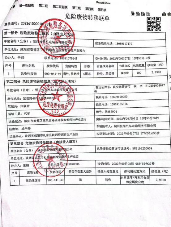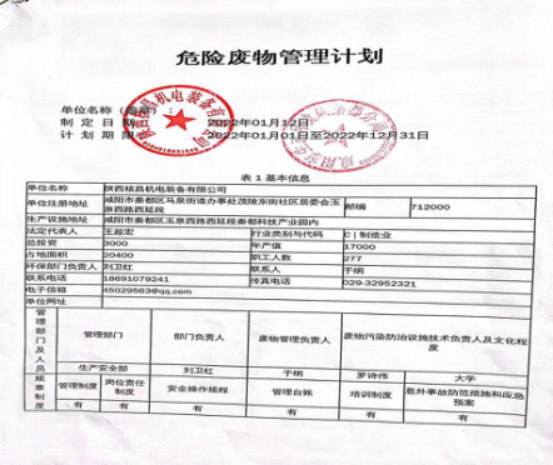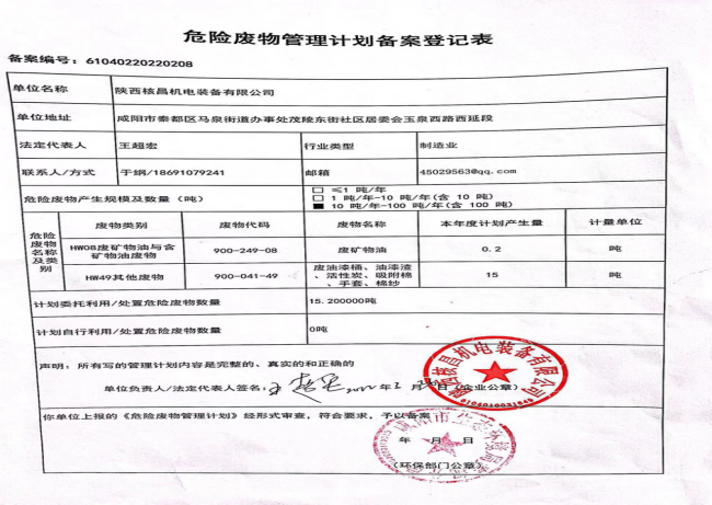 我公司屬機電一體化、機械加工等產業的生產及經營活動, 現階段主要的危險廢物包括:油漆桶、廢機油、乳化液、噴漆、噴砂。油漆桶、廢機油、乳化液等危險廢物處置由陜西明瑞資源再生有限公司承接轉運及處理危廢;噴漆、噴砂房等由公司投入大量資金進行升級改造,在經營活動中加強職工環保培訓,不斷提升職工環保意識。經陜西格林秦灃環??萍?/span>有限公司監測,所排廢氣均達到國家標準。為改善環境、大氣質量作出積極的貢獻。