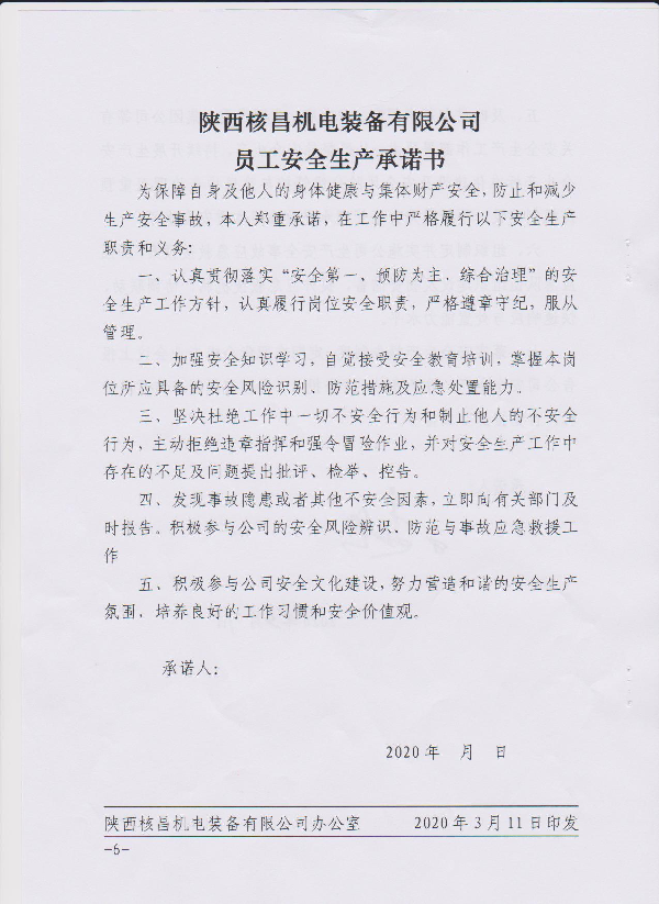 陜西核昌機(jī)電裝備有限公司關(guān)于印發(fā)安全生產(chǎn)承諾的通知